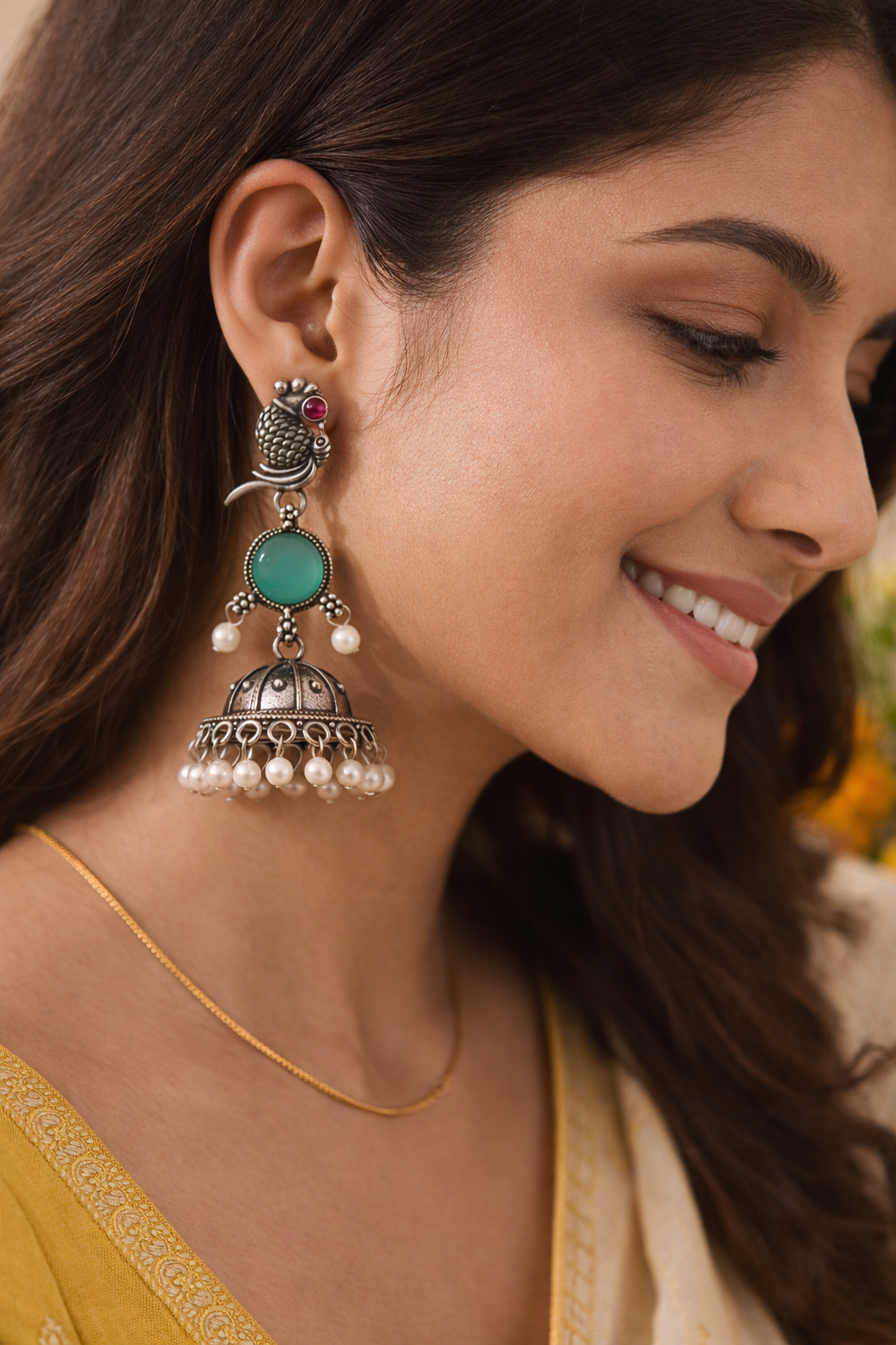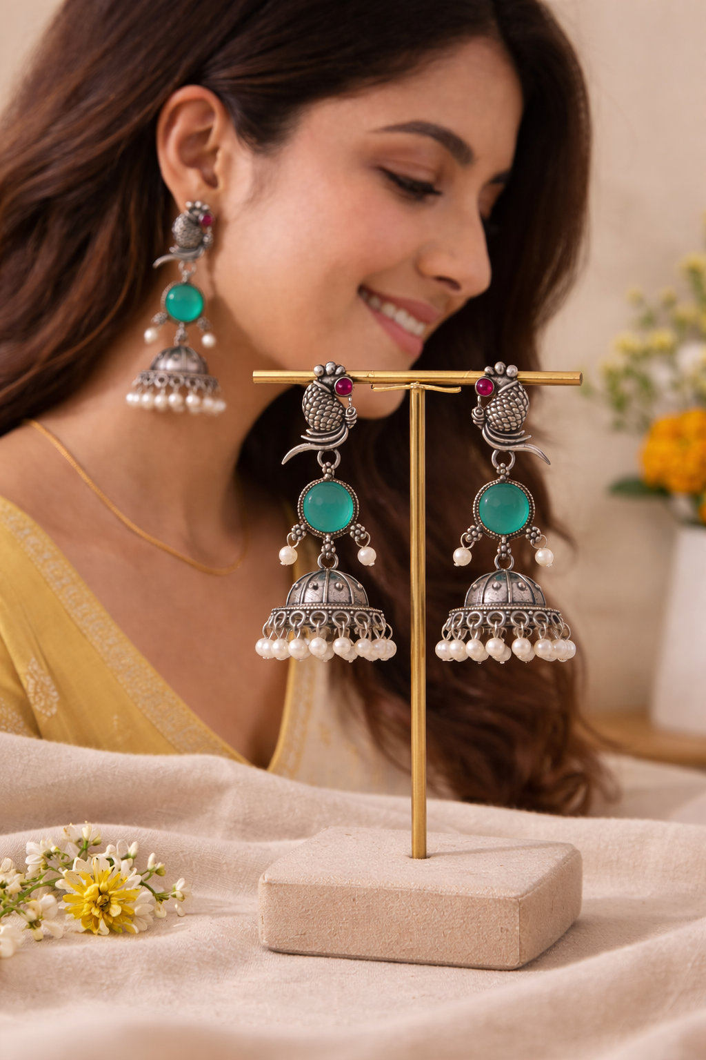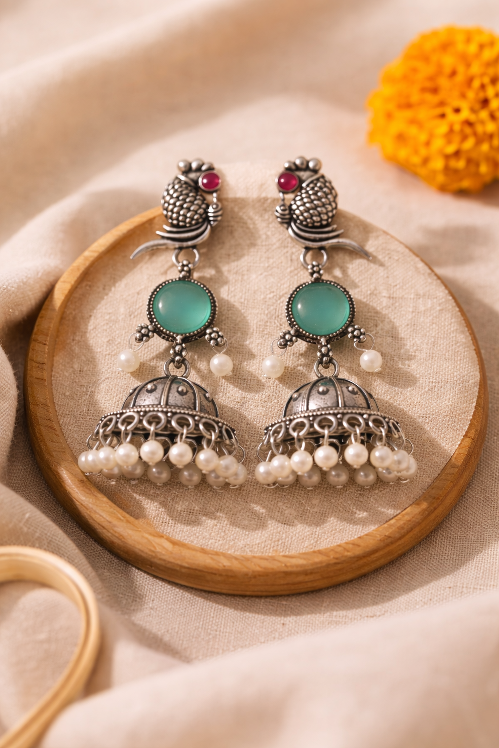 Oxidised Peacock Jhumka Earrings | Blue Stone & Pearl Drop Traditional Jewellery for Women & Girls