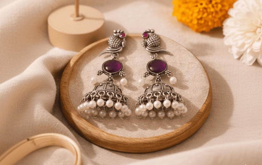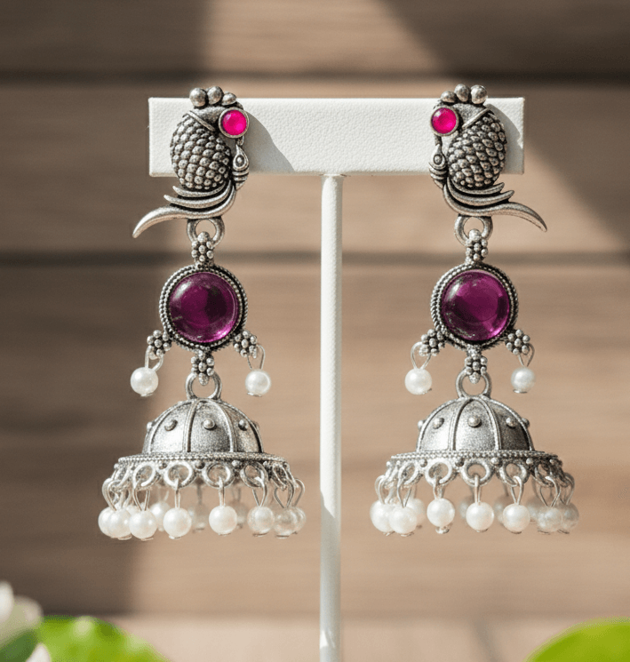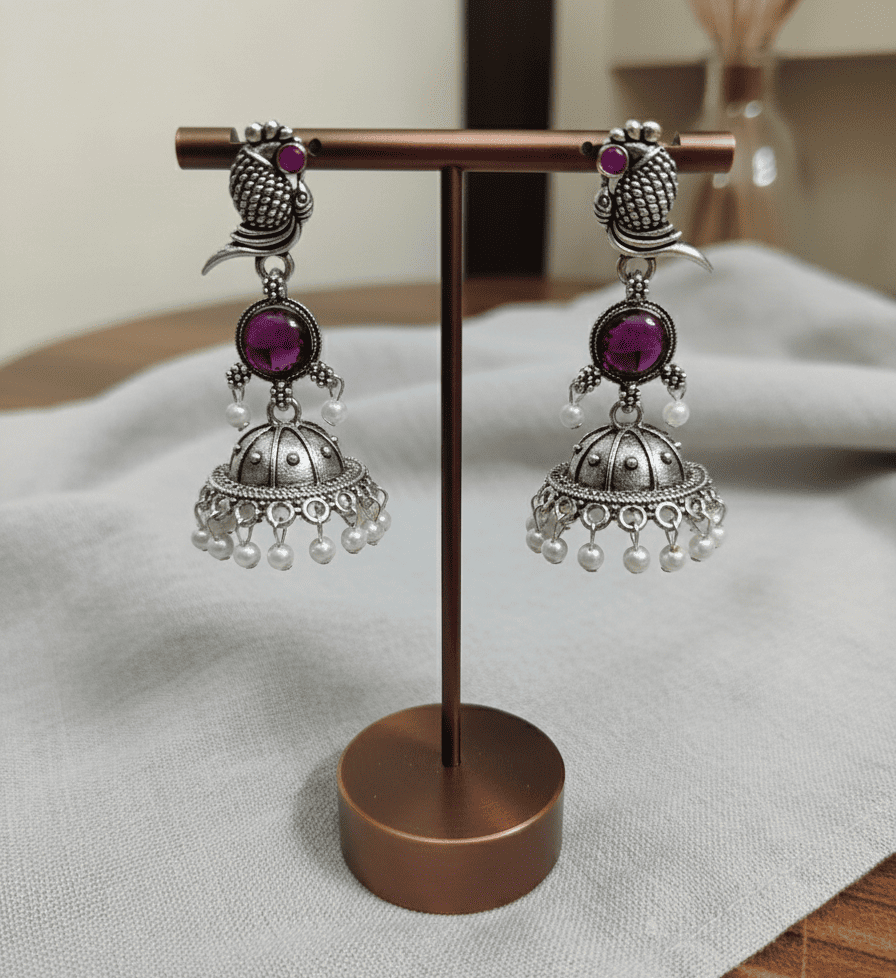 Oxidised Peacock Jhumka Earrings | Purple Stone & Pearl Drop Traditional Jewellery for Women & Girls