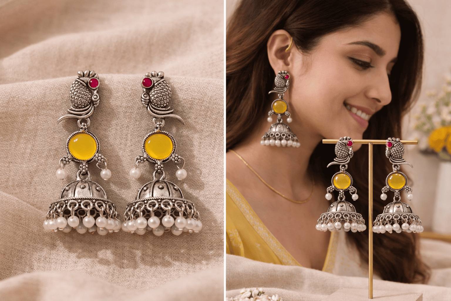 Make a statement with Ethnicstylista’s latest Oxidized Peacock Jhumkas. Featuring a striking yellow stone and elegant pearl accents, these handcrafted beauties are the ultimate finishing touch for your ethnic look.