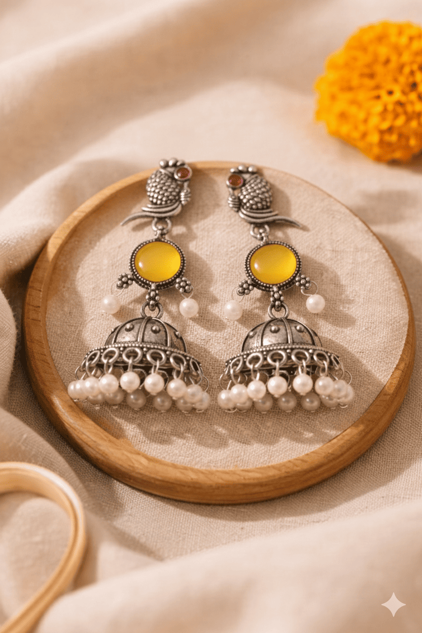 Vintage Charm for Your Next Celebration Make a statement with Ethnicstylista’s latest Oxidized Peacock Jhumkas. Featuring a striking yellow stone and elegant pearl accents, these handcrafted beauties are the ultimate finishing touch for your ethnic look.