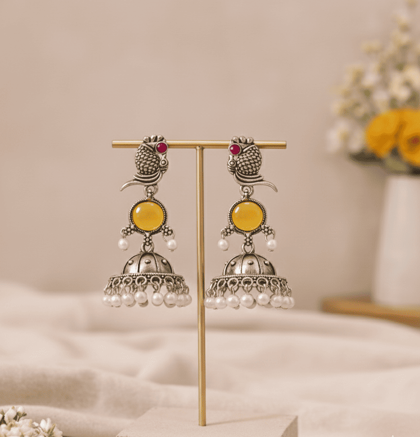 Oxidised Peacock Jhumka Earrings | Yellow Stone & Pearl Drop Traditional Jewellery for Women & Girls